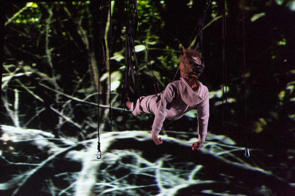 Il y a 20 ans, jeune danseuse, Stéphanie Chêne est victime d’un accident de cheval qui aurait pu lui coûter les jambes. Ce texte autobiographique est un voyage intime, une histoire où le désir et la force permettent un dépassement de soi et de ses propres limites, où la vie se réinvente tout le temps, malgré les contraintes et les règles. C’est suspendue que Stéphanie Chêne incarne ce récit saisissant, à l’image de ces longues journées figées, de ces mois d’attente dans le centre de rééducation pour grands blessés qu’elle a fréquenté. Elle est harnachée, corsetée au milieu des poulies, des sangles et des poids : une femme emmêlée dans les guindes, totalement bloquée, perdue dans le vide. Le visage seul s’anime. Il est joyeux, gourmand, bourré d’envie de jouissance. Mais le corps infirme oppose un interdit sans appel. L’actrice glisse au milieu de ses liens, se couche, se pend. Pierre Guillois invente ainsi un dispositif scénique saisissant pour le spectateur où la mise en scène s’amuse du sol, point d’ancrage et d’équilibre. La comédienne-danseuse joue de cet espace et chaque moment devient une danse de résistance. Ainsi éclatent sous nos yeux la vie qui bouillonne sous l’entrave, la vigueur de la jeune prisonnière dont la sublime volonté rivalise avec le miracle.
